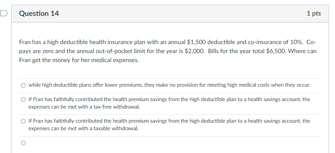 Solved Question 14 1 Pts Fran Has A High Deductible Health Chegg Com